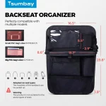 TSUMBAY BACKSEAT ORGANIZER: Our car backseat organizer provides ample space for all your essentials with dimensions of 23.6*16.5*1.9inch when unfolded. Featuring a convenient tray, internal transparent bag, three-dimensional pockets, high-density mesh pockets, and touch screen transparent PVC pockets, it's designed to keep your belongings neatly organized on the go.